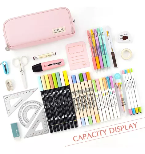 Capacidad: Tamaño de 22 x 11 x 6.5 cm con capacidad de almacenamiento para hasta 50 bolígrafos o 90 lápices. Bolsa de malla para pequeños artículos de papelería como gomas y stickers. Espacio intermedio para bolígrafos más cortos de uso frecuente.