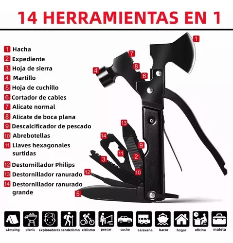 Este martillo de diseño exclusivo para acampar se adapta al, al uso diario en el hogar, al senderismo, a la exploración, a la aventura, a actividades al aire libre, etc.se puede usar como regalo de Navidad o cumpleaños para papá, esposo, novio.